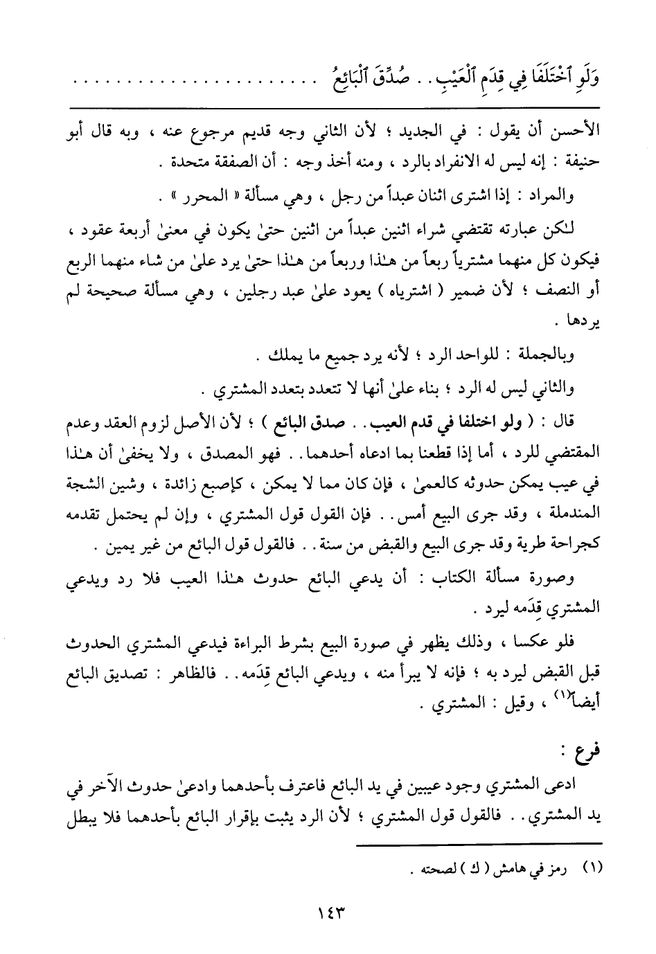 لكن عبارته تقتضي شراء اثنين عبدًا من اثنين حتى يكون في معنى أربعة عقود، فيكون كل منهما مشتريًا ربعًا من هذا وربعًا من هذا حتى يرد على من شاء منهما الربع أو النصف؛ لأن ضمير (اشترياه) يعود على عبد رجلين، وهي مسألة صحيحة لم يردها.