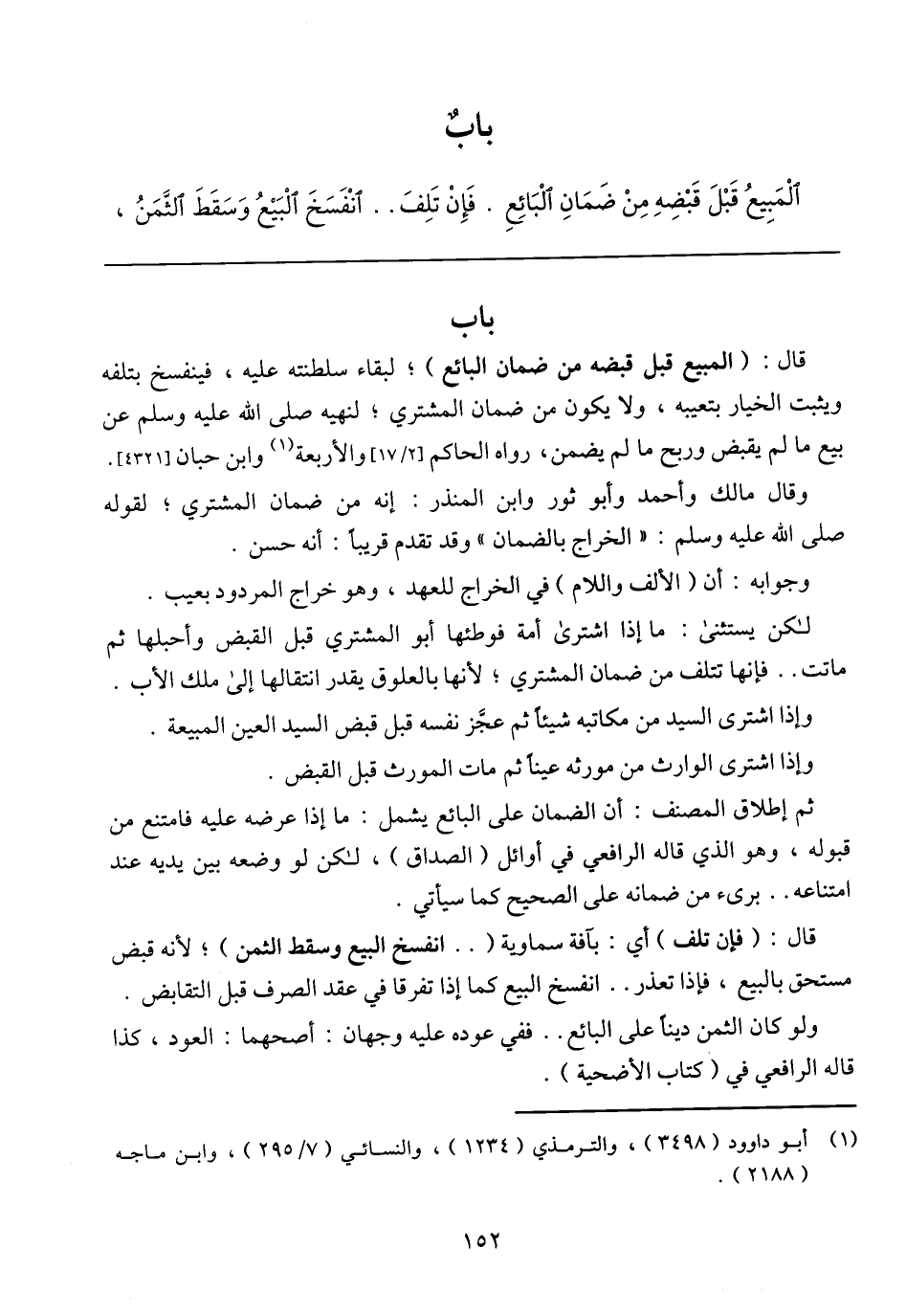 قال: (المبيع قبل قبضه من ضمان البائع)؛ لبقاء سلطنته عليه، فينفسخ بتلفه ويثبت الخيار بتعيبه، ولا يكون من ضمان المشتري؛ لنهيه صلى الله عليه وسلم عن بيع ما لم يقبض وربح ما لم يضمن، رواه الحاكم [2/ 17] والأربعة وابن حبان [4321].
