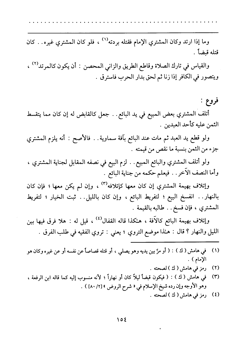وإتلاف بهيمة المشتري إن كان معها كإتلافه، وإن لم يكن معها؛ فإن كان بالنهار .. انفسخ البيع؛ لتفريط البائع، وإن كان بالليل .. ثبت الخيار؛ لتفريط المشتري، فإن فسخ .. طالبه بالقيمة.