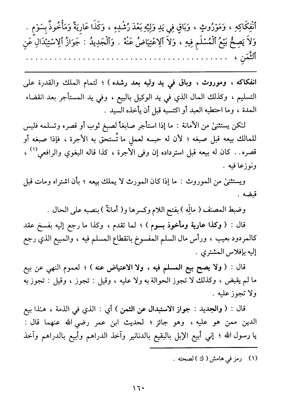 انْفِكَاكِهِ، وَمَوْرُوثٍ، وَبَاقٍ فِي يَدِ وَلِيَّهِ بَعْدَ رُشْدِهِ، وَكَذَا عَارِيَةٌ وَمَاخُوذٌ بِسَوْمٍ. وَلَا يَصِحُّ بَيْعُ الْمُسْلَمِ فِيهِ، وَلَا الاِعْتِيَاضُ عَنْهُ. وَالْجَدِيدُ: جَوَازُ الاِسْتِبْدَالِ عَنِ الثَّمَنِ،