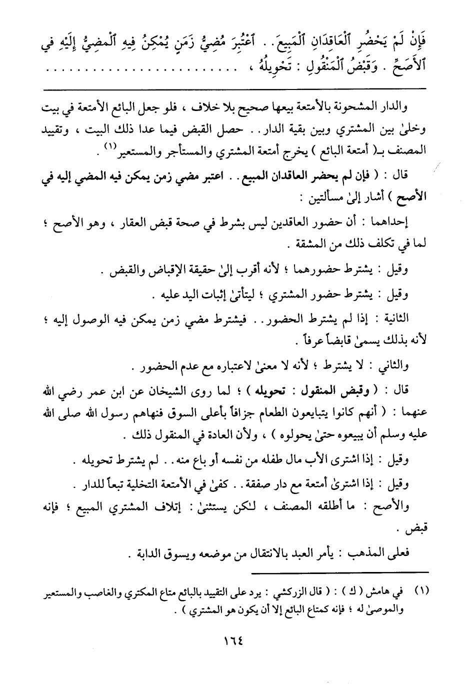 فَإِنْ لَمْ يَحْضُرِ الْعَاقِدَانِ الْمَبِيعَ .. اعْتُبِرَ مُضِيُّ زَمَنٍ يُمْكِنُ فِيهِ الْمضِيُّ إِلَيْهِ في الأَصَحِّ. وَقَبْضُ الْمَنْقُولِ: تَحْوِيلُهُ،