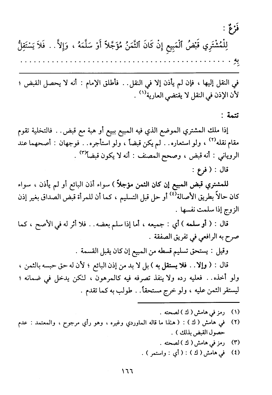 لِلْمُشْتَرِي قَبْضُ الْمَبِيعِ إِنْ كَانَ الثَّمَنُ مُؤَجَّلًا أَوْ سَلَّمَهُ، وَإِلَّا .. فَلَا يَسْتَقِلُّ بِهِ