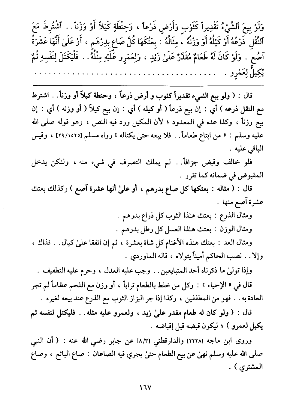 وَلَوْ بِيعَ الشَّيْءُ تَقْدِيرًا كَثَوْبٍ وَأَرْضٍ ذَرْعًا، وَحِنْطَةٍ كَيْلًا أَوْ وَزْنًا .. اشْتُرِطَ مَعَ النَّقْلِ ذَرْعُهُ أَوْ كَيْلُهُ أَوْ وَزْنُهُ، مِثَالُهُ: بِعْتُكَهَا كُلَّ صَاعٍ بِدِرْهَمٍ، أَوْ عَلَى أَنَّهَا عَشَرَةُ آصُعٍ. وَلَوْ كَانَ لَهُ طَعَامٌ مُقَدَّرٌ عَلَى زَيْدٍ، وَلِعَمْرٍو عَلَيْهِ مِثْلُهُ .. فَلْيَكْتَلْ لِنَفْسِهِ ثُمَّ يُكِيلُ لِعَمْرٍو