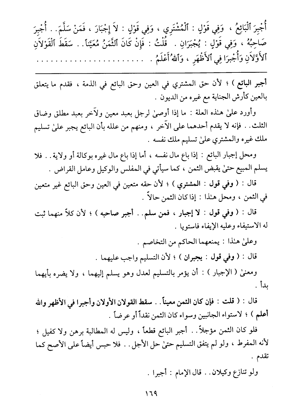 ومحل إجبار البائع: إذا باع مال نفسه، أما إذا باع مال غيره بوكالة أو ولاية .. فلا يسلم المبيع حتى يقبض الثمن، كما سيأتي في المفلس والوكيل وعامل القراض.