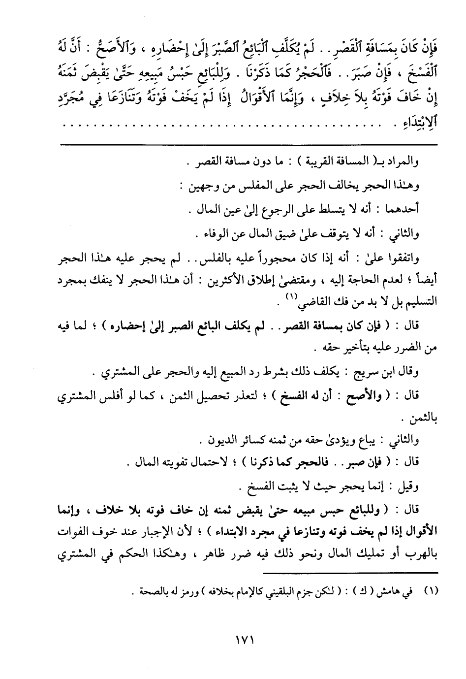 فَإِنْ كَانَ بِمَسَافَةِ الْقَصْرِ .. لَمْ يُكَلَّفِ الْبَائِعُ الصَّبْرَ إِلَى إِحْضَارِهِ، وَالأَصَحُّ: أَنَّ لَهُ الْفَسْخَ، فَإِنْ صَبَرَ .. فَالْحَجْرُ كَمَا ذَكَرْنَا. وَلِلْبَائِعِ حَبْسُ مَبِيعِهِ حَتَّى يَقْبِضَ ثَمَنَهُ إِنْ خَافَ فَوْتَهُ بِلَا خِلَافِ، وَإِنَّمَا الأَقْوَالُ إِذَا لَمْ يَخَفْ فَوْتَهُ وَتَنَازَعَا فِي مُجَرَّدِ الِابْتِدَاءِ