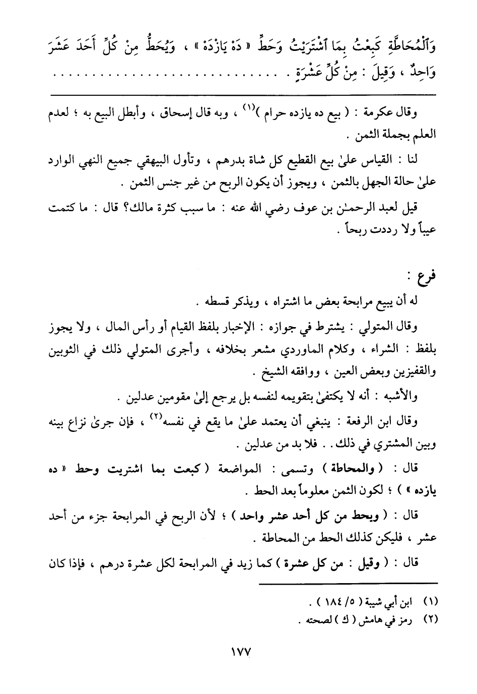 وَالْمُحَاطَّةِ كَبِعْتُ بِمَا اشْتَرَيْتُ وَحَطِّ (دَهْ يَازْدَهْ)، وَيُحَطُّ مِنْ كُلِّ أَحَدَ عَشَرَ وَاحِدٌ، وَقِيلَ: مِنْ كُلِّ عَشْرَةٍ