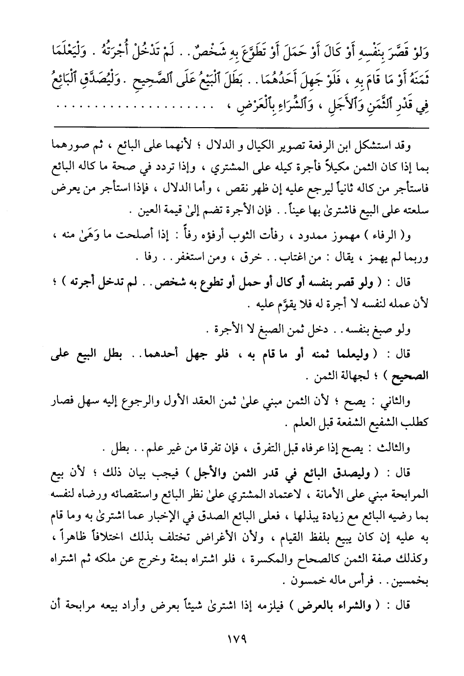 وَلوْ قَصَّرَ بِنَفْسِهِ أَوْ كَالَ أَوْ حَمَلَ أَوْ تَطَوَّعَ بِهِ شَخْصٌ .. لَمْ تَدْخُلْ أُجْرَتُهُ. وَلْيَعْلَمَا ثَمَنَهُ أَوْ مَا قَامَ بِهِ، فَلَوْ جَهِلَ أَحَدُهُمَا .. بَطَلَ الْبَيْعُ عَلَى الصَّحِيحِ. وَلْيُصَدَّقِ الْبَائِعُ فِي قَدْرِ الثَّمَنِ وَالأَجَلِ، وَالشِّرَاءِ بِالْعَرْضِ،