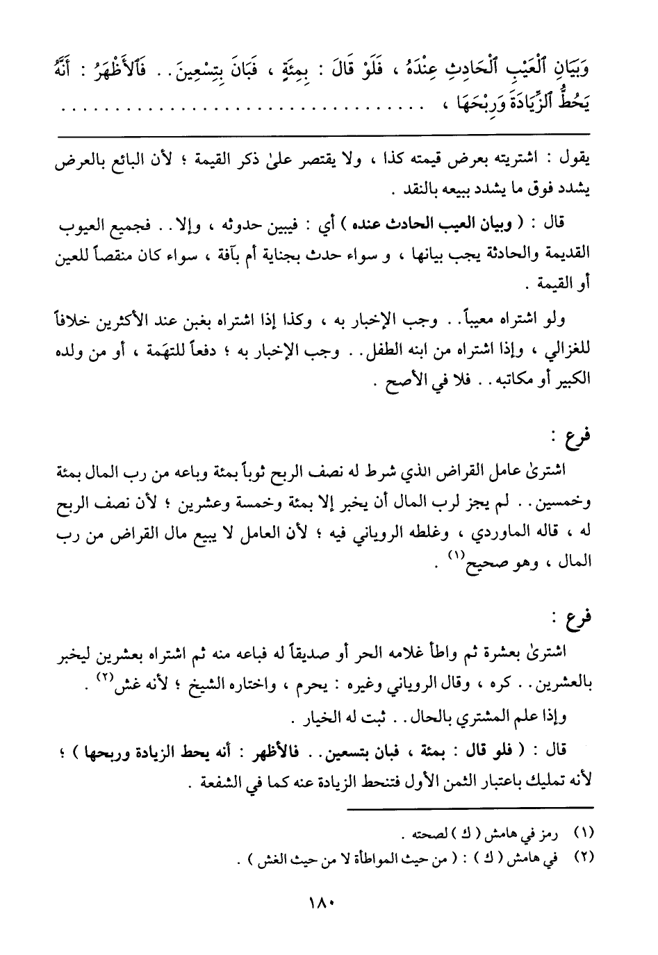 ولو اشتراه معيبًا .. وجب الإخبار به، وكذا إذا اشتراه بغبن عند الأكثرين خلافًا للغزالي، وإذا اشتراه من ابنه الطفل .. وجب الإخبار به؛ دفعًا للتهمة، أو من ولده الكبير أو مكاتبه .. فلا في الأصح.