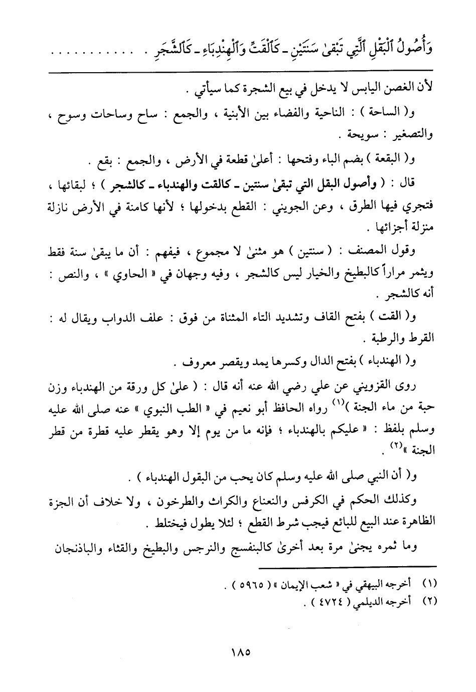 وَأُصُولُ الْبَقْلِ الَّتِي تَبْقى سَنَتَيْنِ –كَالْقَتِّ وَالْهِنْدِبَاءِ- كَالشَّجَرِ