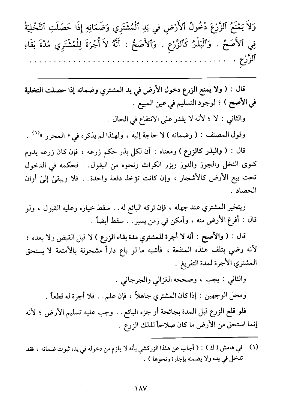 قال: (ولا يمنع الزرع دخول الأرض في يد المشتري وضمانه إذا حصلت التخلية في الأصح)؛ لوجود التسليم في عين المبيع.