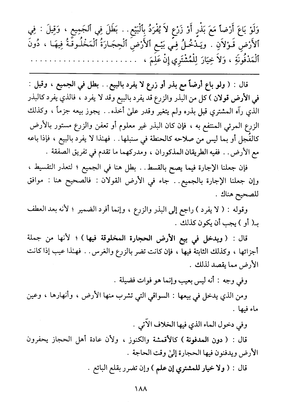 وَلَوْ بَاعَ أَرْضًا مَعَ بَذْرٍ أَوْ زَرْعٍ لَا يُفْرَدُ بِالْبَيْعِ .. بَطَلَ فِي الجَمِيعٍ، وَقِيلَ: فِي الأَرْضِ قَوْلَانِ. ويَدْخُلُ فِي بَيْعِ الأَرْضِ الْحِجَارَةُ الْمَخْلُوقةُ فِيهَا، دُونَ الْمَدْفُونَةِ، وَلَا خِيَارَ لِلْمُشْتَرِي إِنْ عَلِمَ،