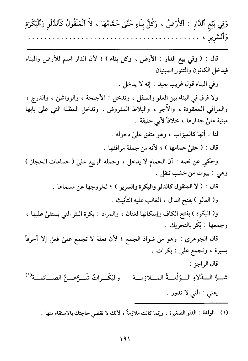 وَفِي بَيْعِ الدَّارِ: الأَرْضُ، وَكُلُّ بِنَاءٍ حَتَّى حَمَّامُهَا، لَا الْمَنْقُولُ كَالدَّلْوِ وَالْبَكَرَةِ وَالسَّرِيرِ،
