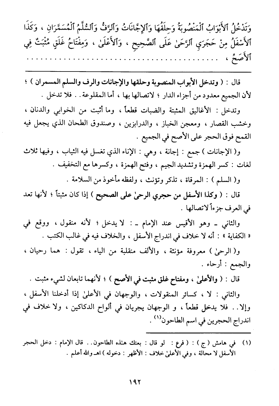 وتدخل: الأغاليق المثبتة والضبات قطعًا، وما أثبت من الخوابي والدنان، وخشب القصار، ومعجن الخباز، والدرابزين، وصندوق الطحان الذي يجعل فيه القمح فوق الحجر على الأصح في الجميع.