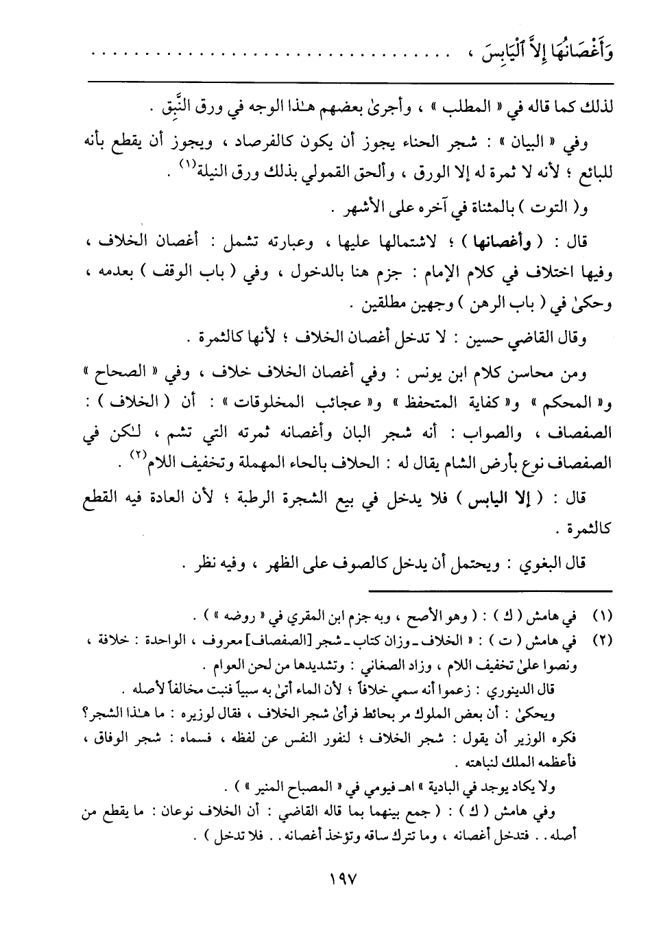 ومن محاسن كلام ابن يونس: وفي أغصان الخلاف خلاف، وفي (الصحاح) و (المحكم) و (كفاية المتحفظ) و (عجائب المخلوقات): أن (الخلاف): الصفصاف، والصواب: أنه شجر البان وأغصانه ثمرته التي تشم، لكن في الصفصاف نوع بأرض الشام يقال له: الحلاف بالحاء المهملة وتخفيف اللام.