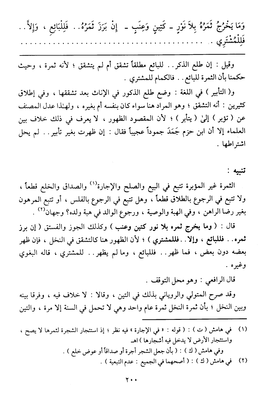 وَمَا يَخْرُجُ ثَمَرُهُ بِلَا نَوْرٍ –كَتِينٍ وَعِنَبٍ- إِنْ بَرَزَ ثَمَرُهُ .. فَلِلْبَائِعِ، وَإِلَّا .. فَلِلْمُشْتَرِي