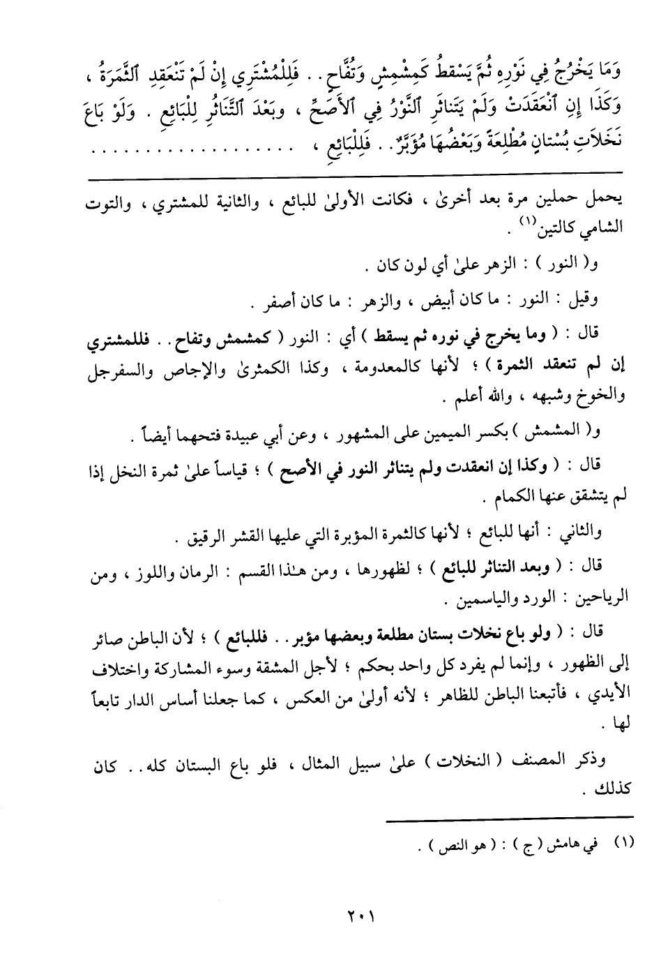 وَمَا يَخْرُجُ فِي نَوْرِهِ ثُمَّ يَسْقطُ كَمِشْمِشٍ وَتُفَّاحٍ .. فَلِلْمُشْتَرِي إِنْ لَمْ تَنْعَقِدِ الثَّمَرَةُ، وَكَذَا إِنِ انْعَقَدَتْ وَلَمْ يَتَناثَرِ النَّوْرُ فِي الأًصَحِّ، وبَعْدَ التَّنَاثُرِ لِلْبَائِعِ. وَلَوْ بَاعَ نَخَلَاتِ بُسْتانٍ مُطْلِعَةً وَبَعْضُهَا مُؤَبَّرٌ .. فَلِلْبَائِعِ،
