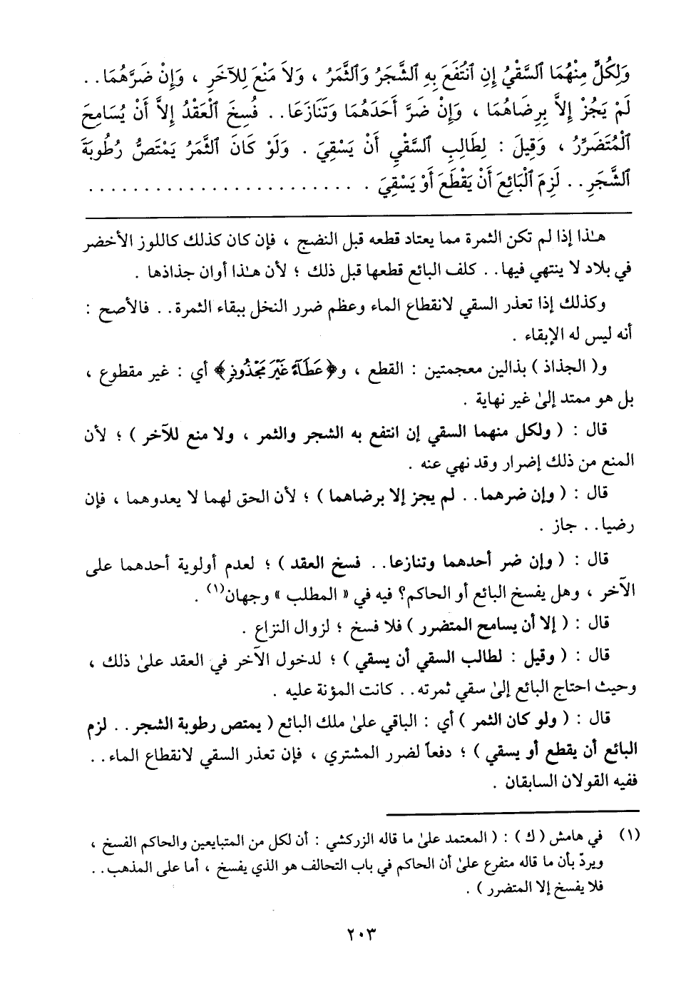 وَلِكُلٍّ مِنْهُمَا السَّقْيُ إِنِ انْتَفَعَ بِهِ الشَّجَرُ والثَّمَرُ، وَلَا مَنْعَ لِلآخَرِ، وَإِنْ ضَرَّهُمَا .. لَمْ يَجُزْ إِلَّا بِرِضَاهُمَا، وَإِنْ ضَرَّ أَحَدَهُمَا وَتَنَازَعَا .. فُسِخَ الْعَقْدُ إِلَّا أَنْ يُسَامِحَ الْمُتَضَرِّرُ، وَقِيلَ: لِطَالِبِ السَّقْيِ أَنْ يَسْقِيَ. وَلَوْ كَانَ الثَّمَرُ يَمْتَصُّ رُطُوبَةَ الشَّجَرِ .. لَزِمَ الْبَائِعَ أَنْ يَقْطَعَ أَوْ يَسْقِيَ