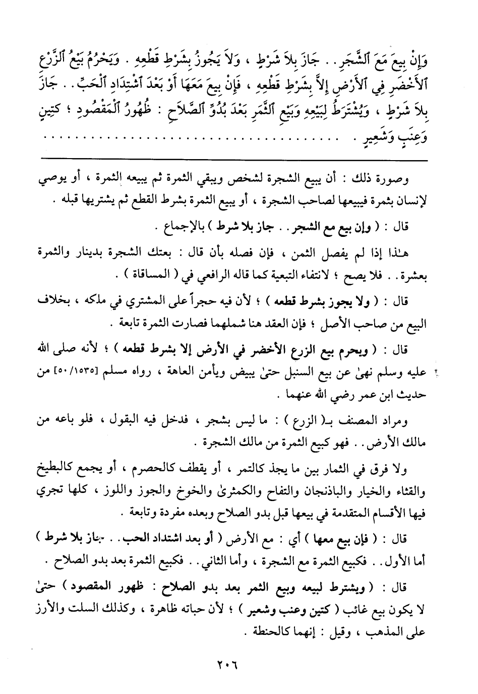وَإِنْ بِيعَ مَعَ الشَّجَرِ .. جَازَ بِلَا شَرْطٍ، وَلَا يَجُوزُ بِشَرْطِ قَطْعِهِ. وَيَحْرُمُ بَيْعُ الزَّرْعِ الأَخْضَرِ فِي الأَرْضِ إِلَّا بِشَرْطِ قَطْعِهِ، فَإِنْ بِيعَ مَعَهَا أَوْ بَعْدَ اشْتِدَادِ الْحَبِّ .. جَازَ بِلَا شَرْطٍ، وَيُشْتَرَطُ لِبَيْعِهِ وَبَيْعِ الثَّمَرِ بَعْدَ بُدُوِّ الصَّلَاحِ: ظُهُورُ الْمَقْصُودِ؛ كتِينٍ وَعِنَبٍ وَشَعِيرٍ