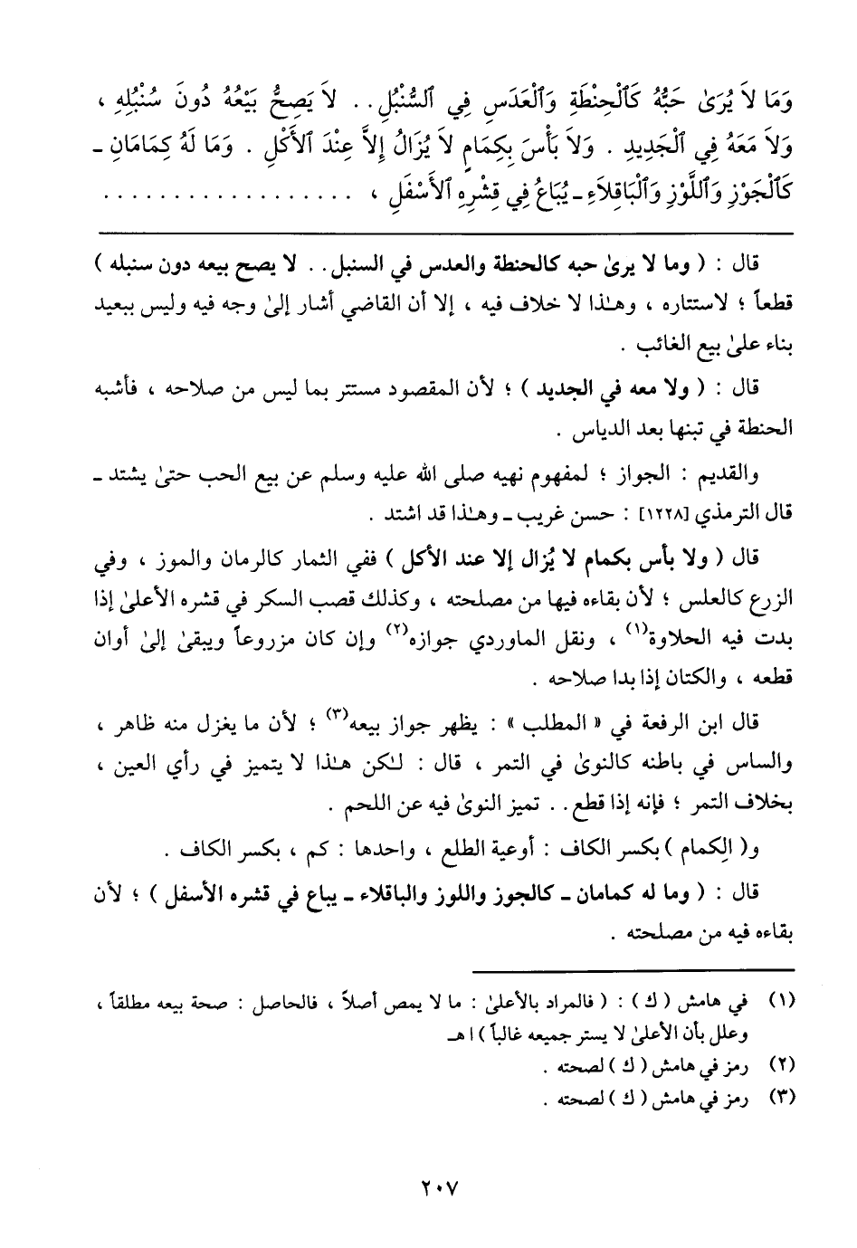 وَمَا لَا يُرَى حَبُّهُ كَالْحِنْطَةِ وَالْعَدَسِ فِي السُّنْبُلِ .. لَا يَصِحُّ بَيْعُهُ دُونَ سُنْبُلِهِ، وَلَا مَعَهُ فِي الْجَدِيدِ. وَلَا بَاسَ بِكِمَامٍ لَا يُزَالُ إِلَّا عِنْدَ الأَكْلِ. وَمَا لَهُ كِمَامَانِ –كَالْجَوْزِ وَاللَّوْزِ وَالْبَاقِلَاءِ- يُبَاعُ فِي قِشْرِهِ الأًسْفَلِ،