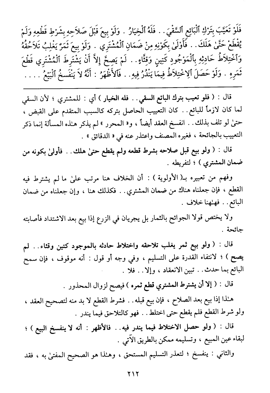 فَلَوْ تَعَيَّبَ بِتَرْكِ الْبَائِعِ السَّقْيَ .. فَلَهُ الْخِيَارُ. وَلَوْ بِيعَ قَبْلَ صَلَاحِهِ بِشَرْطِ قَطْعِهِ وَلَمْ يُقْطَعْ حَتَّى هَلَكَ .. فَأَوْلَى بِكَوْنِهِ مِنْ ضَمَانِ الْمُشْتَرِي. وَلَوْ بِيعَ ثَمَرٌ يَغْلِبُ تَلَاحُقُهُ وَاخْتِلَاطُ حَادِثِهِ بِالْمَوْجُودِ كَتِينٍ وَقِثَّاءٍ .. لَمْ يَصِحَّ إِلَّا أَنْ يَشْتَرِطَ الْمُشْتَرِي قَطْعَ ثَمَرِهِ. وَلَوْ حَصَلَ الاِخْتِلَاطُ فِيمَا يَنْدُرُ فِيهِ .. فَالأَظْهَرُ: أَنَّهُ لَا يَنْفَسخُ الْبَيْعُ