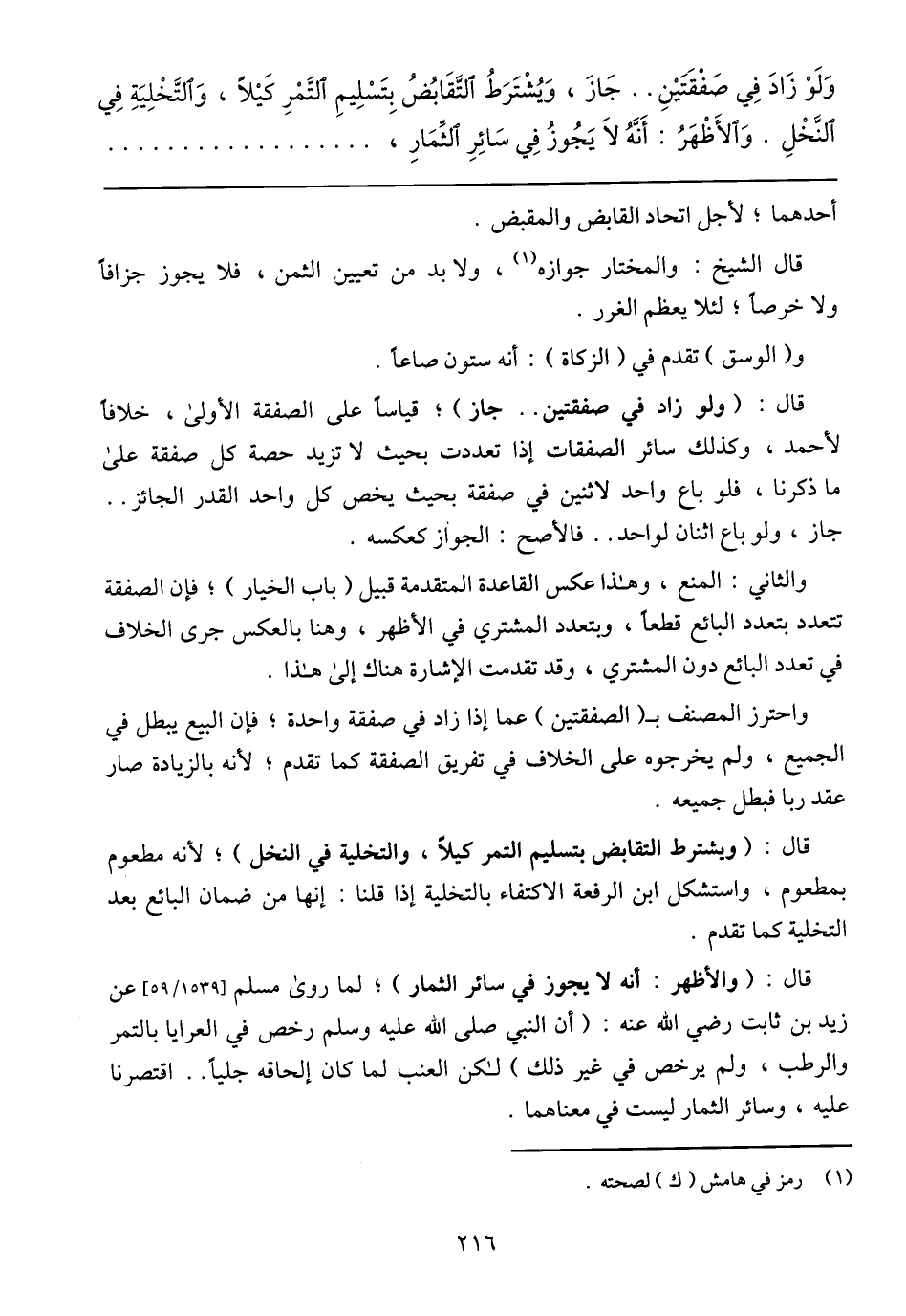 وَلَوْ زَادَ فِي صَفْقَتَيْنِ .. جَازَ، وَيُشْتَرَطُ التَّقَابُضُ بِتَسْلِيمِ التَّمْرِ كَيْلًا، وَالتَّخْلِيَةِ فِي النَّخْلِ. وَالأَظْهَرُ: أَنَّهُ لَا يَجُوزُ فِي سَائِرِ الثِّمَارِ،