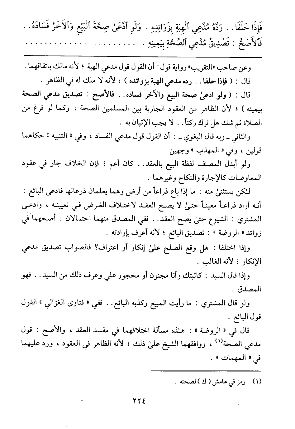 لكن يستثنى منه: ما إذا باع ذراعًا من أرض وهما يعلمان ذرعانها فادعى البائع: أنه أراد ذراعًا معينًا حتى لا يصح العقد لاختلاف الغرض في تعيينه، وادعى المشتري: الشيوع حتى يصح العقد .. ففي المصدق منهما احتمالان: أصحهما في زوائد (الروضة): تصديق البائع؛ لأنه أعرف بإرادته.