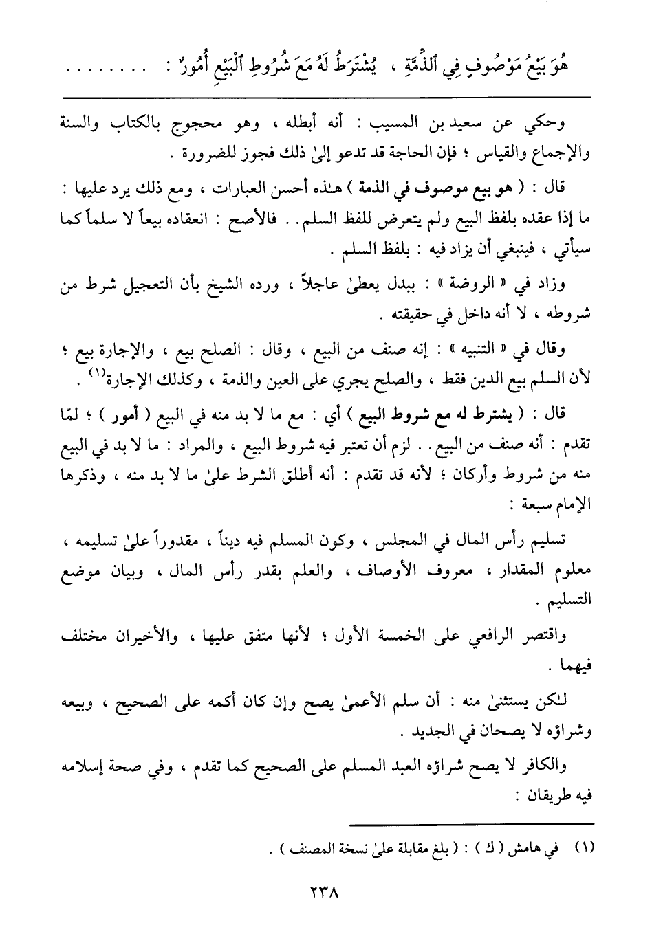 قال: (يشترط له مع شروط البيع) أي: مع ما لابد منه في البيع (أمور)؛ لما تقدم: أنه صنف من البيع .. لزم أن تعتبر فيه شروط البيع، والمراد: ما لابد في البيع منه من شروط وأركان؛ لأنه قد تقدم: أنه أطلق الشرط على ما لابد منه، وذكرها الإمام سبعة: