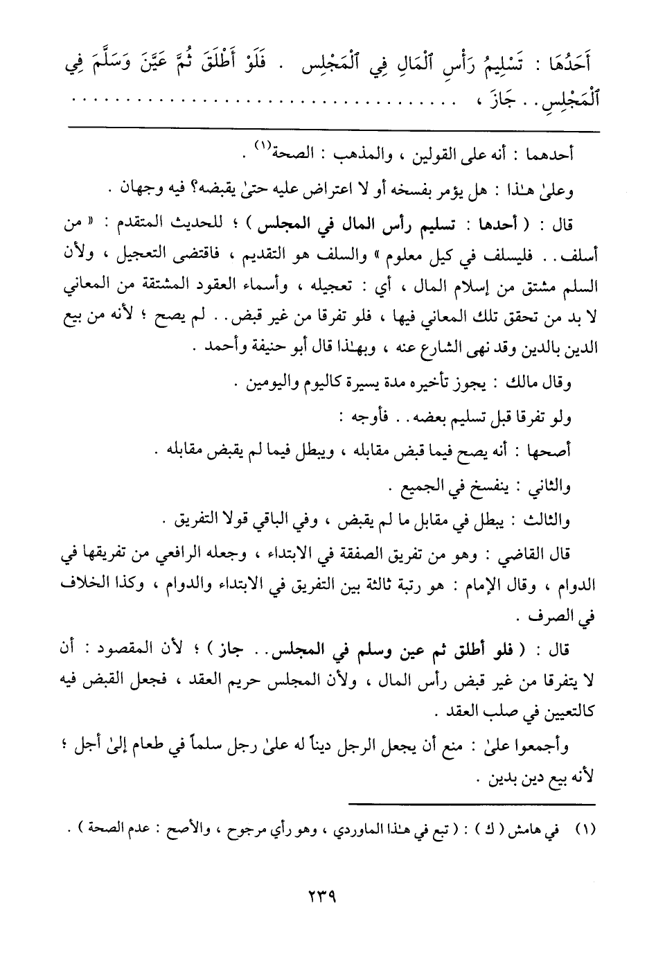 قال: (أحدها: تسليم رأس المال في المجلس)؛ للحديث المتقدم: (من أسلف .. فليسلف في كيل معلوم) والسلف هو التقديم، فاقتضى التعجيل، ولأن السلم مشتق من إسلام المال، أي: تعجيله، وأسماء العقود المشتقة من المعاني لابد من تحقيق تلك المعاني فيها، فلو تفرقا من غير قبض .. لم يصح؛ لأنه من بيع الدين بالدين وقد نهى الشارع عنه، وبهذا قال أبو حنيفة وأحمد.