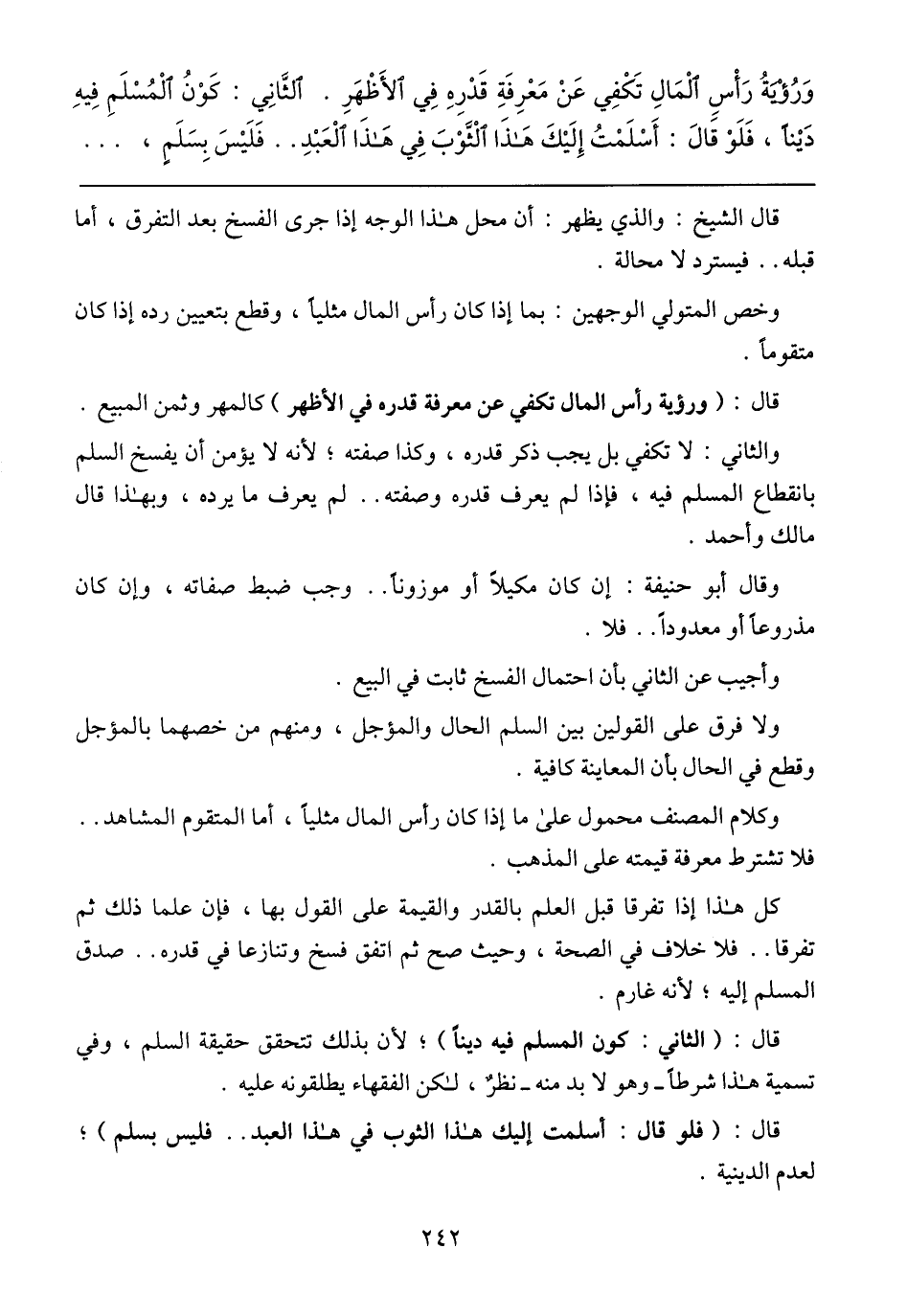 وَرُؤْيَةُ رَاسِ الْمَالِ تَكْفِي عَنْ مَعْرِفَةِ قَدْرِهِ فِي الأَظْهَرِ. الثَّانِي: كَوْنُ الْمُسْلَمِ فِيهِ دَيْنًا، فَلَوْ قَالَ: أَسْلَمْتُ إِلَيْكَ هَذَا الْثَّوْبَ فِي هَذَا الْعَبْدِ .. فَلَيْسَ بِسَلَمٍ،