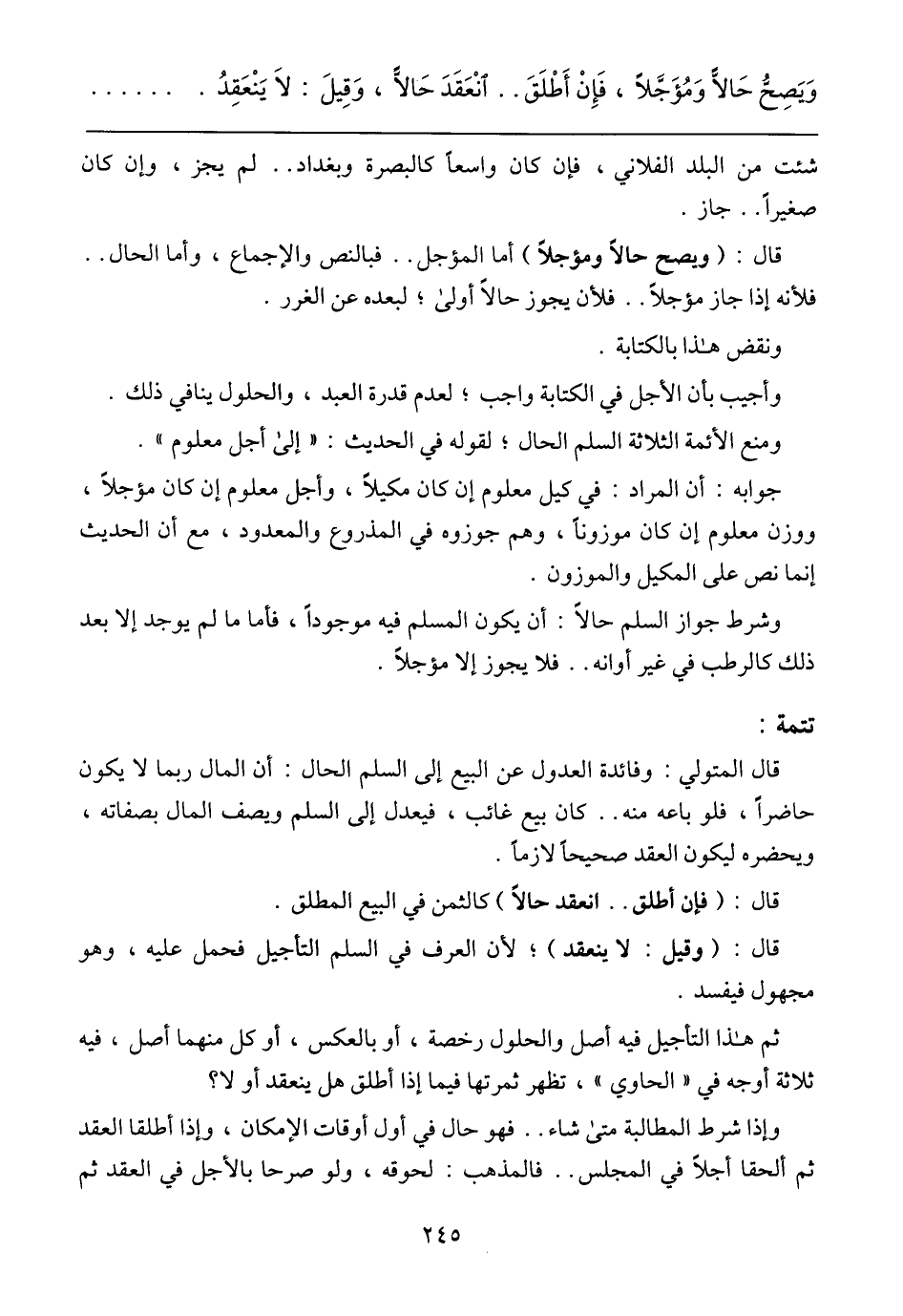 وشرط جواز السلم حالًا: أن يكون المسلم فيه موجودًا، فأما ما لم يوجد إلا بعد ذلك كالرطب في غير أوانه .. فلا يجوز إلا مؤجلًا.