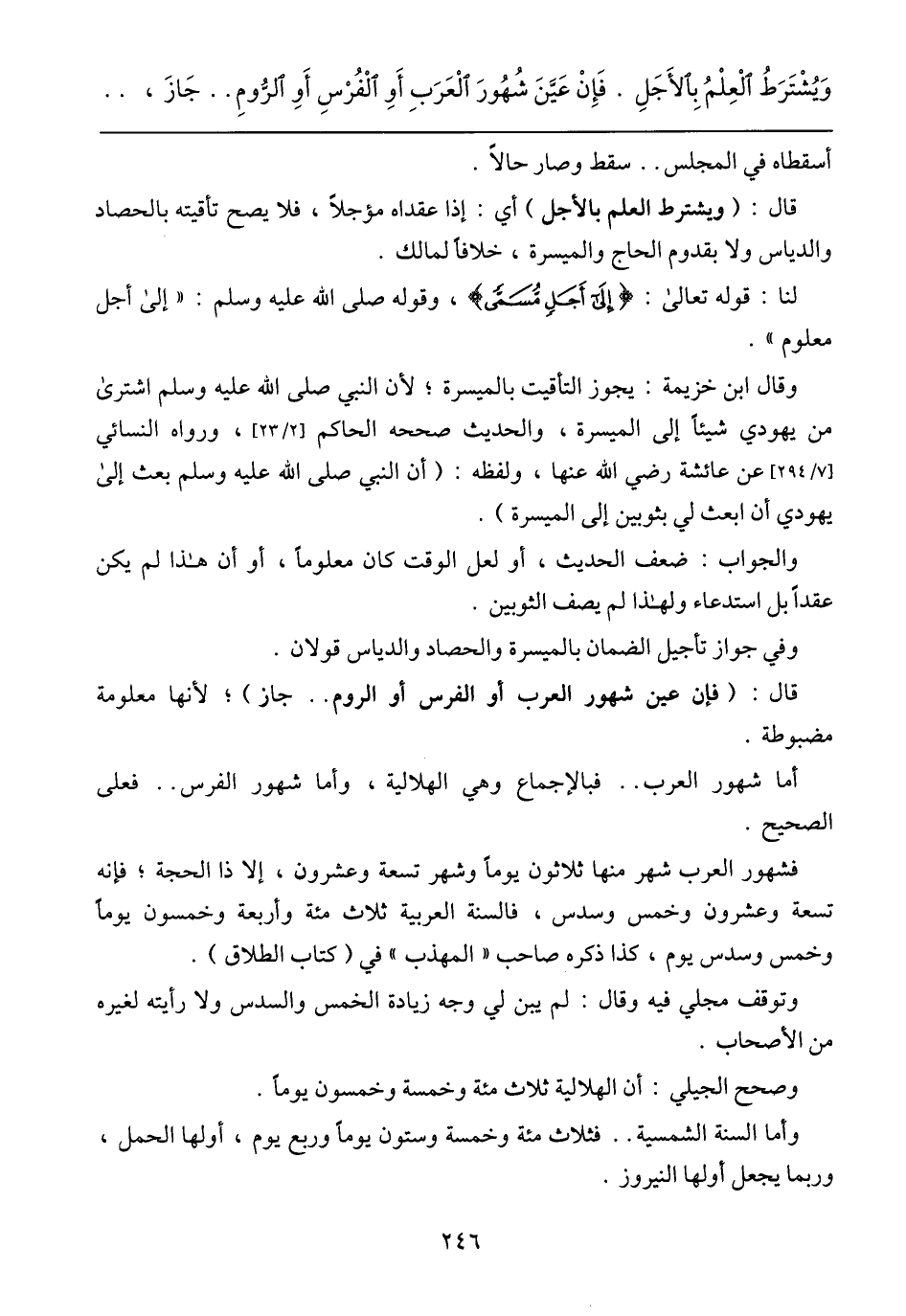 وقال ابن خزيمة: يجوز التأقيت بالميسرة؛ لأن النبي صلى الله عليه وسلم اشترى من يهودي شيئًا إلى الميسرة، والحديث صححه الحاكم [2/ 23]، ورواه النسائي [7/ 294] عن عائشة رضي الله عنها، ولفظه: (أن النبي صلى الله عليه وسلم بعث إلى يهودي أن ابعث لي بثوبين إلى الميسرة).