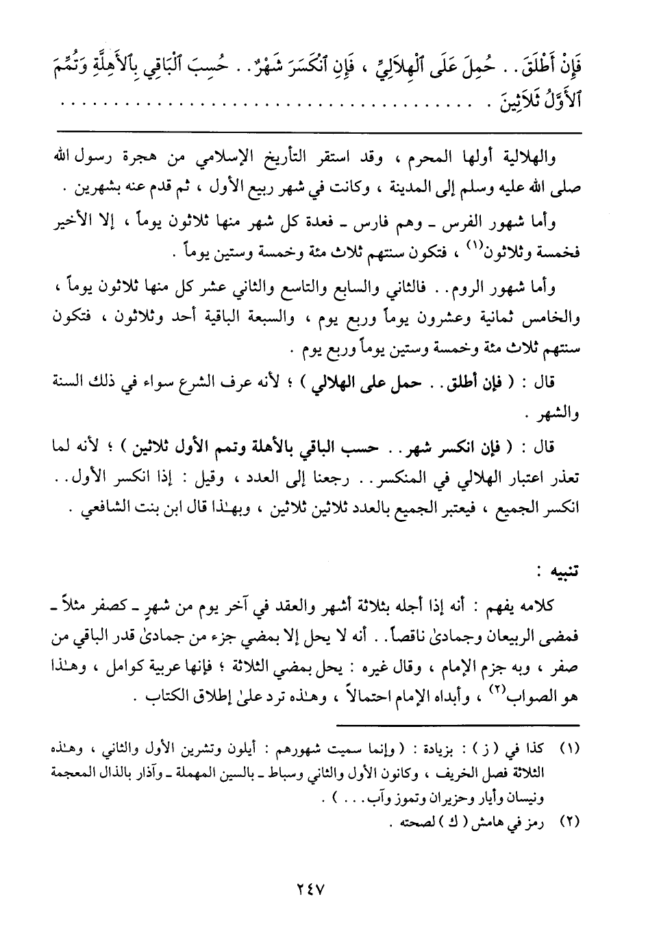قال: (فإن انكسر شهر .. حسب الباقي بالأهلة وتمم الأول ثلاثين)؛ لأنه لما تعذر اعتبار الهلالي في المنكسر .. رجعنا إلى العدد، وقيل: إذا انكسر الأول .. انكسر الجميع، فيعتبر الجميع بالعدد ثلاثين ثلاثين، وبهذا قال ابن بنت الشافعي.