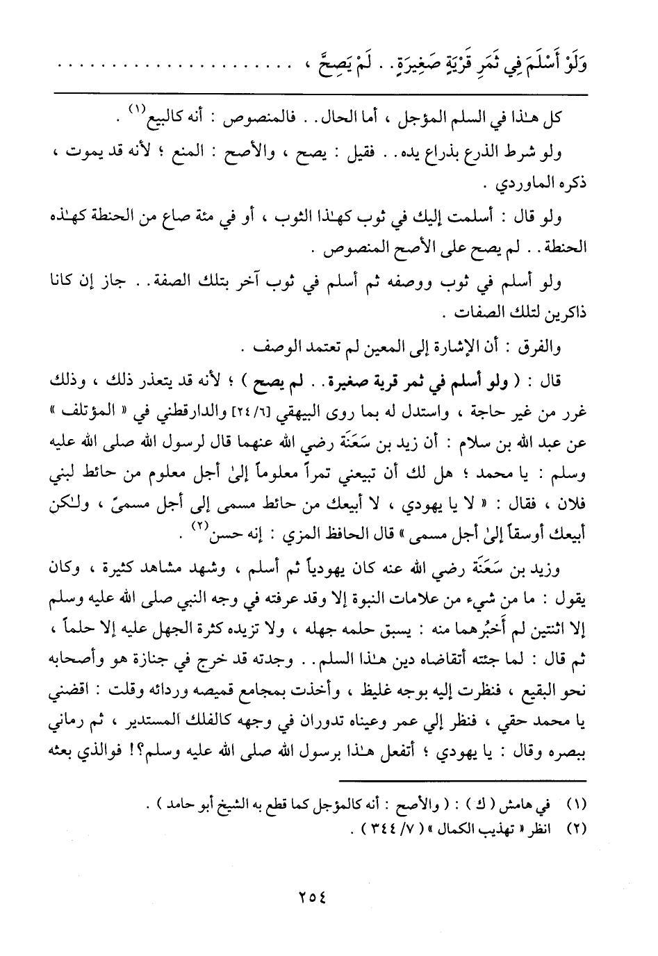 قال: (ولو أسلم في ثمر قرية صغيرة .. لم يصح)؛ لأنه قد يتعذر ذلك، وذلك غرر من غير حاجة، واستدل له بما روى البيهقي [6/ 24] والدارقطني في (المؤتلف) عن عبد الله بن سلام: أن زيد بن سعنة رضي الله عنهما قال لرسول الله صلى الله عليه وسلم: يا محمد؛ هل لك أن تبيعني تمرًا معلومًا إلى أجل معلوم من حائط لبني فلان، فقال: (لا يا يهودي، لا أبيعك من حائط مسمى إلى أجل مسمىً، ولكن أبيعك أوسقًا إلى أجل مسمى) قال الحافظ المزي: إنه حسن.
