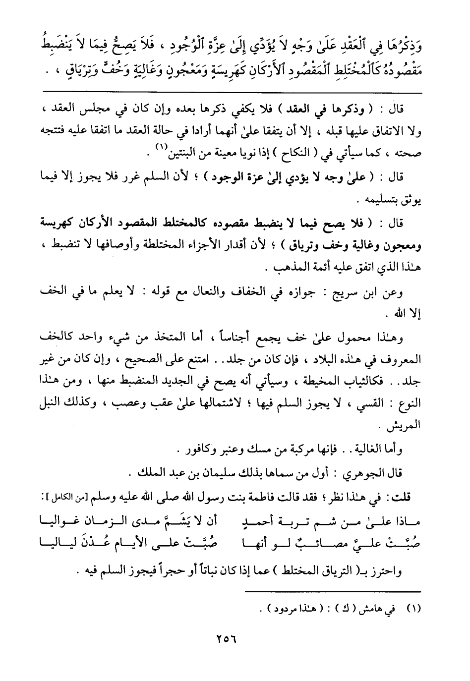 وهذا محمول على خف يجمع أجناسًا، أما المتخذ من شيء واحد كالخف المعروف في هذه البلاد، فإن كان من جلد .. امتنع على الصحيح، وإن كان من غير جلد .. فكالثياب المخيطة، وسيأتي أنه يصح في الجديد المنضبط منها، ومن هذا النوع: القسي، لا يجوز السلم فيها؛ لاشتمالها على عقب وعصب، وكذلك النبل المريش.