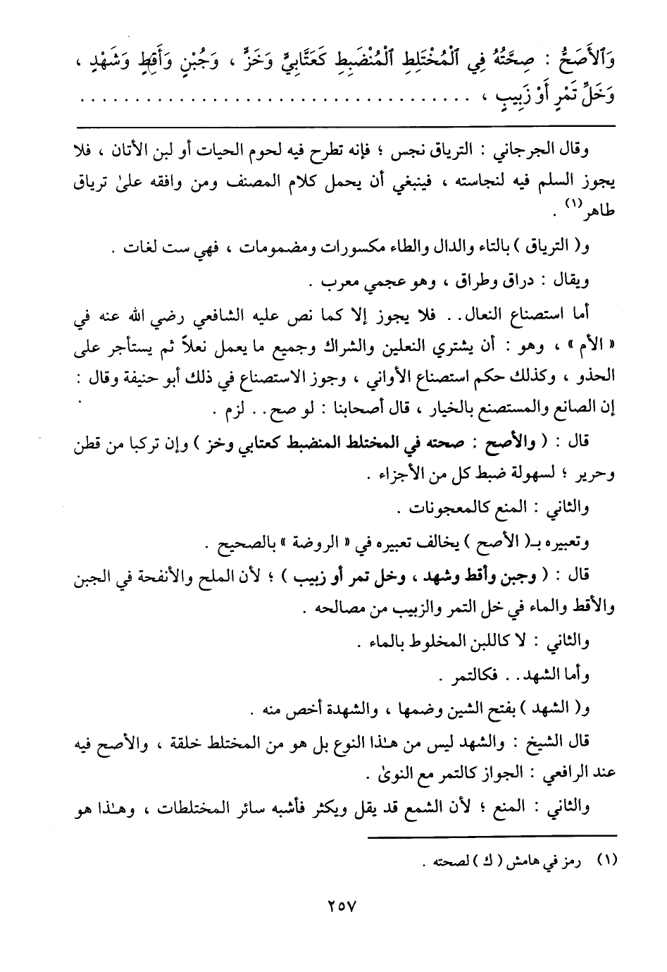 وقال الجرجاني: الترياق نجس؛ فإنه تطرح فيه لحوم الحيات أو لبن الأتان، فلا يجوز السلم فيه لنجاسته، فينبغي أن يحمل كلام المصنف ومن وافقه على ترياق طاهر.