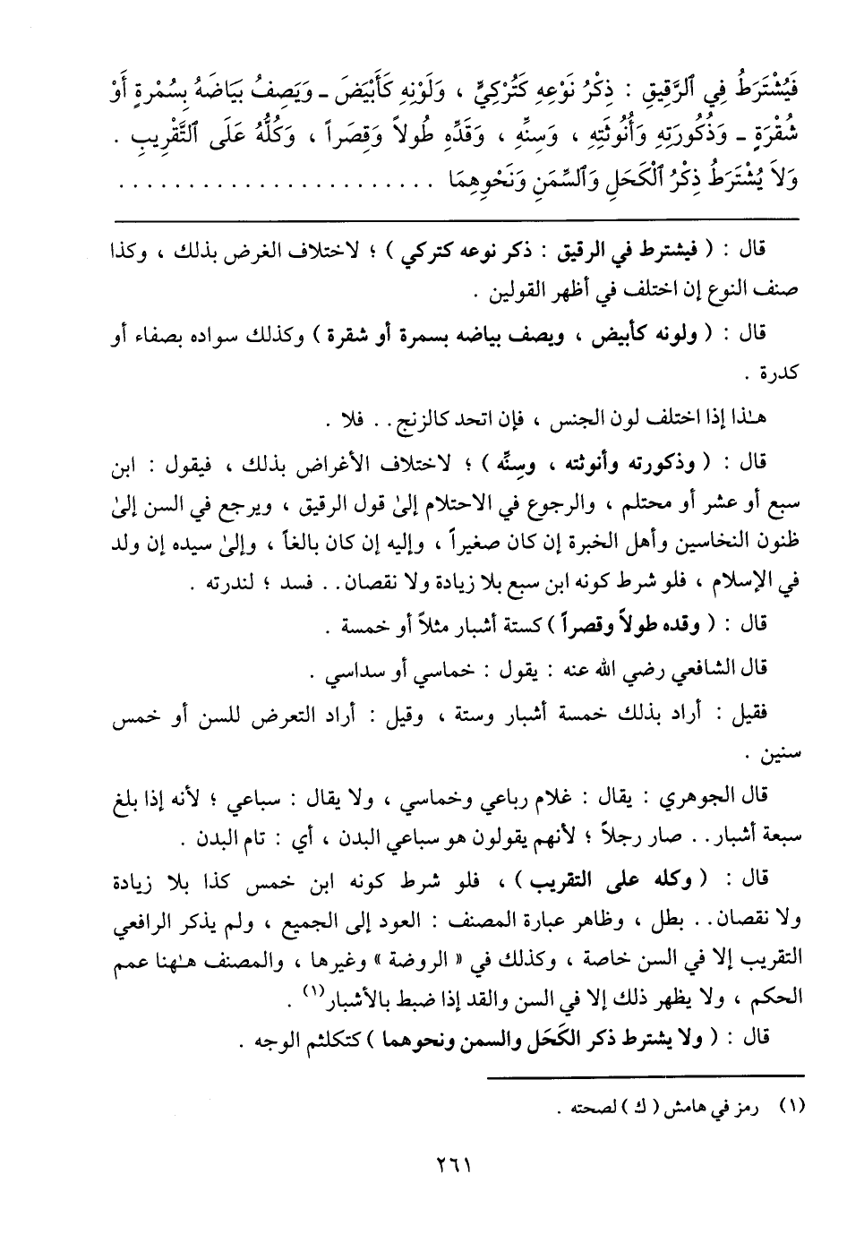 فَيُشْتَرَطُ فِي الرَّقِيقِ: ذِكْرُ نَوْعِهِ كَتُرْكِيٍّ، وَلَوْنِهِ كَأَبْيَضَ –وَيَصِفُ بَيَاضَهُ بِسُمْرةٍ أَوْ شُقْرَةٍ- وَذُكُورَتِهِ وَأُنُوثَتِهِ، وَسِنِّهِ، وَقَدِّهِ طُولًا وَقِصَرًا، وَكُلُّهُ عَلَى التَّقْرِيبِ. وَلَا يُشْتَرَطُ ذِكْرُ الْكَحَلِ وَالسِّمَنِ وَنَحْوِهِمَا