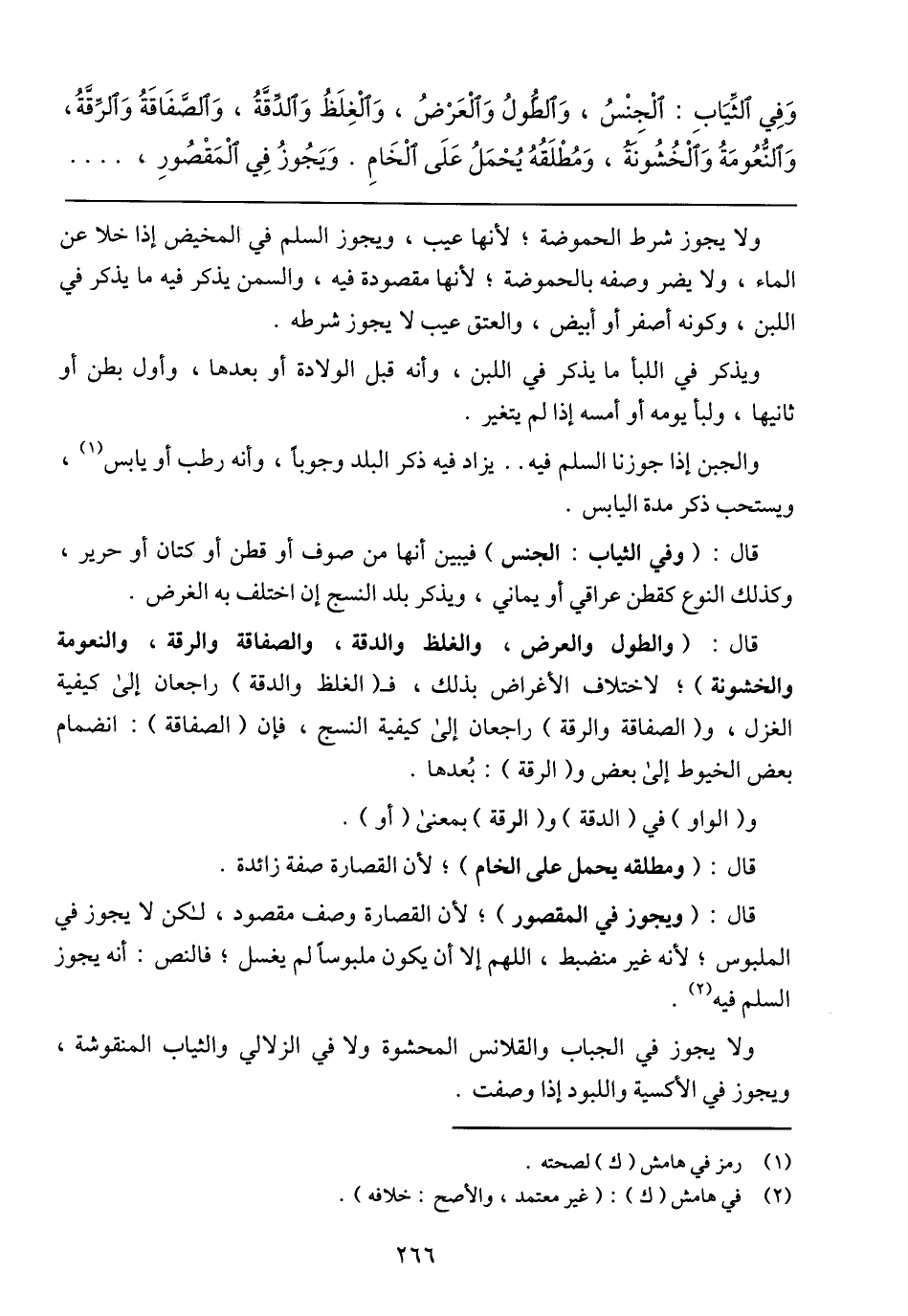 وَفِي الثِّيَابِ: الْجِنْسُ، وَالطُّولُ وَالْعَرْضُ، وَالْغِلَظُ وَالدِّقَّةُ، وَالصَّفَاقَةُ وَالرِّقَّةُ، وَالنُّعُومَةُ والْخُشُونَةُ، وَمُطْلَقُهُ يُحْمَلُ عَلَى الْخَامِ. وَيَجُوزُ فِي الْمَقْصُورِ،