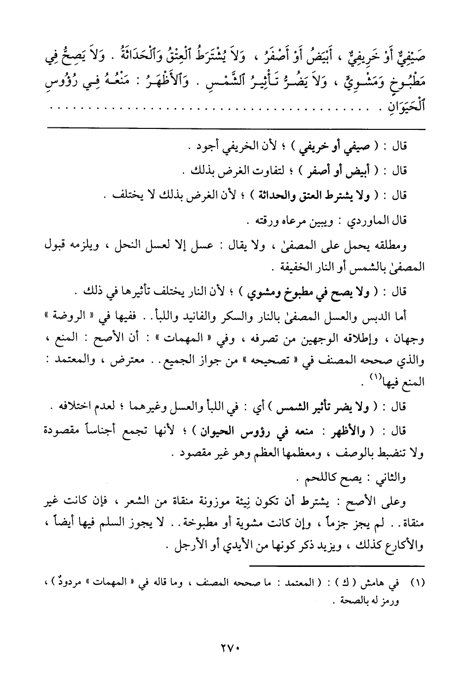 صَيْفِيٌّ أَوْ خَرِيفِيٌّ، أَبْيَضُ أَوْ أَصْفَرُ، وَلَا يُشْتَرَطُ الْعِتْقُ وَالْحَدَاثَةُ. وَلَا يَصِحُّ فِي مَطْبُوخٍ وَمَشْوِيٍّ، وَلَا يَضُرُّ تَاثِيرُ الشَّمْسِ. وَالأَظْهَرُ: مَنْعُهُ فِي رُؤُوسِ الْحَيَوَانِ