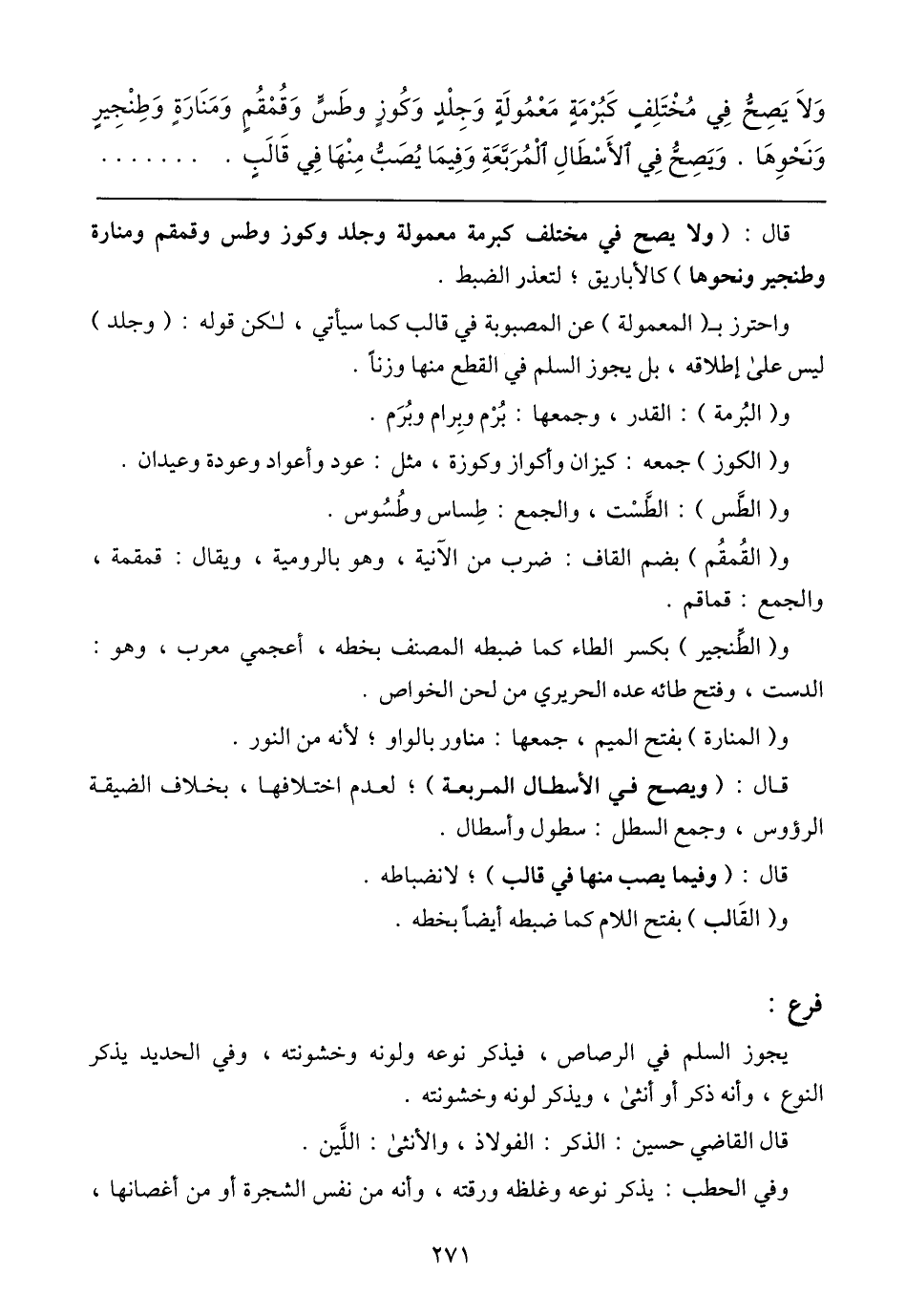 وَلَا يَصِحُّ فِي مُخْتَلِفٍ كَبُرْمَةٍ مَعْمُولَةٍ وَجِلْدٍ وَكُوزٍ وطَسٍّ وَقُمْقُمٍ وَمَنَارَةٍ وَطِنْجِيرٍ وَنَحْوِهَا. وَيَصِحُّ فِي الأَسْطَالِ الْمُرَبَّعَةِ وَفِيمَا يُصَبُّ مِنْهَا فِي قَالَبٍ،