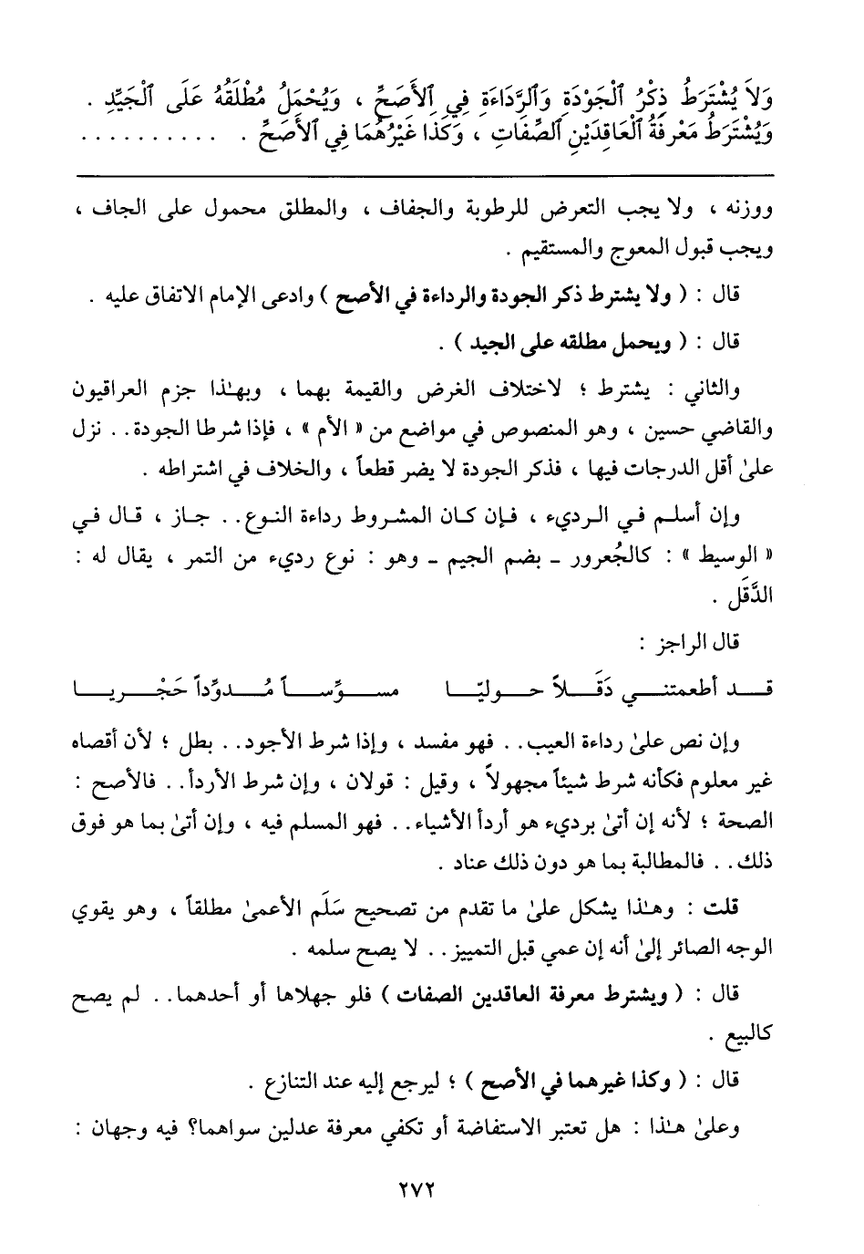 وَلَا يُشْتَرَطُ ذِكْرُ الْجَوْدَةِ وَالرَّدَاءَةِ فِي الأَصَحِّ، وَيُحْمَلُ مُطْلَقُهُ عَلَى الْجَيِّدِ. وَيُشْتَرَطُ مَعْرفَةُ الْعَاقِدَيْنِ الصِّفَاتِ، وَكَذَا غَيْرُهُمَا فِي الأَصَحِّ