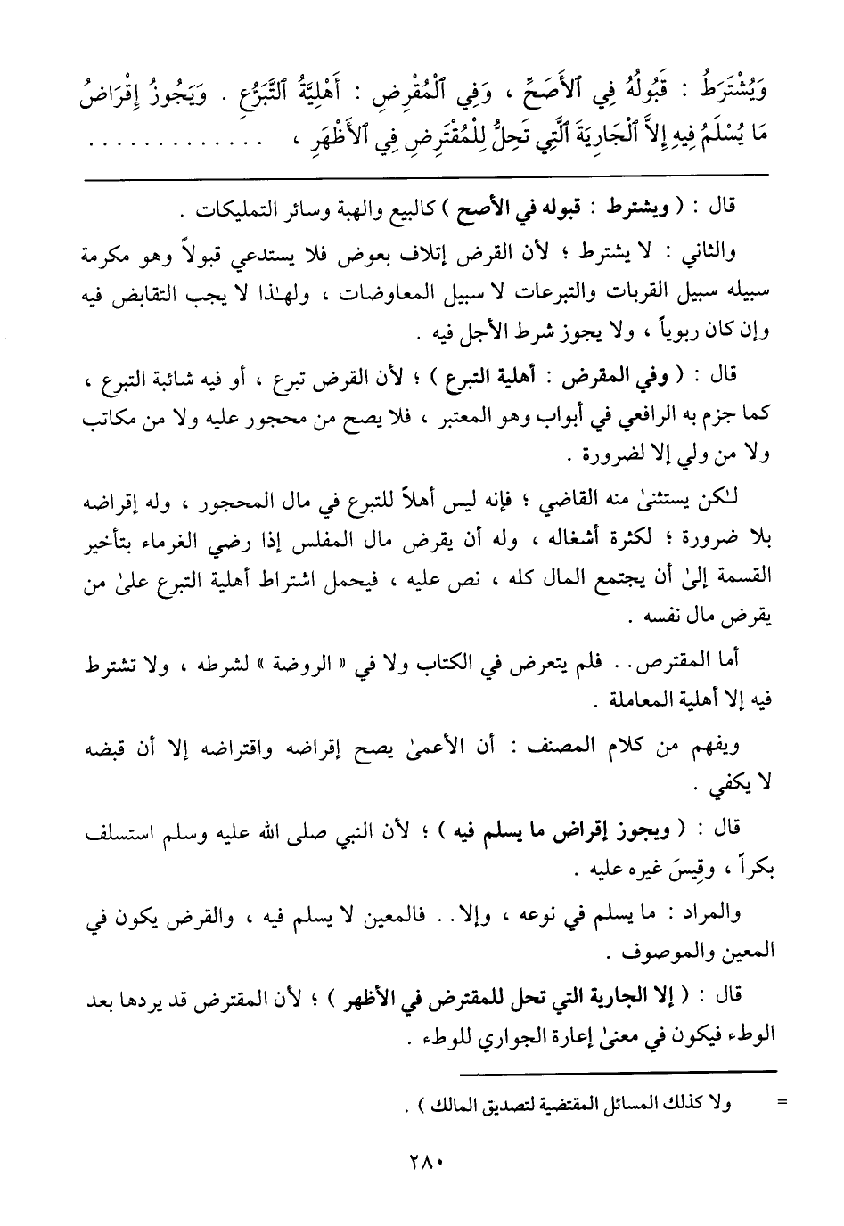 وَيُشْتَرَطُ: قَبُولُهُ فِي الأَصَحِّ، وَفِي الْمُقْرِضِ: أَهْلِيَّةُ التَّبَرُّعِ. وَيَجُوزُ إِقْرَاضُ مَا يُسْلَمُ فِيهِ إِلَّا الْجَارِيَةَ الَّتِي تَحِلُّ لِلْمُقْتَرِضِ فِي الأَظْهَرِ،