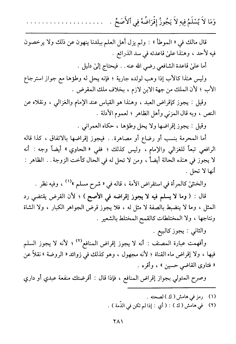 قال: (وما لا يسلم فيه لا يجوز إقراضه في الأصح)؛ لأن القرض يقتضي رد المثل، وما لا ينضبط بالصفة لا مثل له، فلا يجوز قرض الجواهر الكبار، ولا الشاة ونتاجها، ولا المختلطات كالقمح المختلط بالشعير.