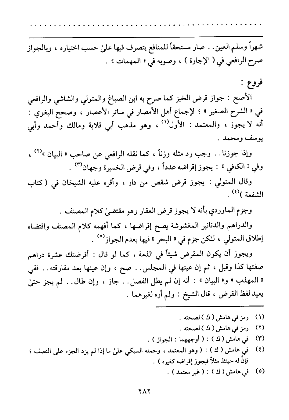 الأصح: جواز قرض الخبز كما صرح به ابن الصباغ والمتولي والشاشي والرافعي في (الشرح الصغير)؛ لإجماع أهل الأمصار في سائر الأعصار، وصحح البغوي: أنه لا يجوز، والمعتمد: الأول، وهو مذهب أبي قلابة ومالك وأحمد وأبي يوسف ومحمد.