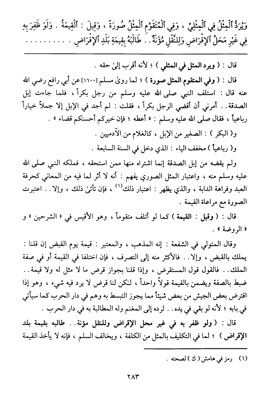 ولم يقضه من إبل الصدقة إنما اشتراه منها ممن استحقه، فملكه النبي صلى الله عليه وسلم منه، واعتبار المثل الصوري يفهم: أنه لا أثر لما فيه من المعاني كحرفة العبد وفراهة الدابة، والذي يظهر: اعتبار ذلك، فإن تأتى ذلك، وإلا .. اعتبرت الصورة مع مراعاة القيمة.
