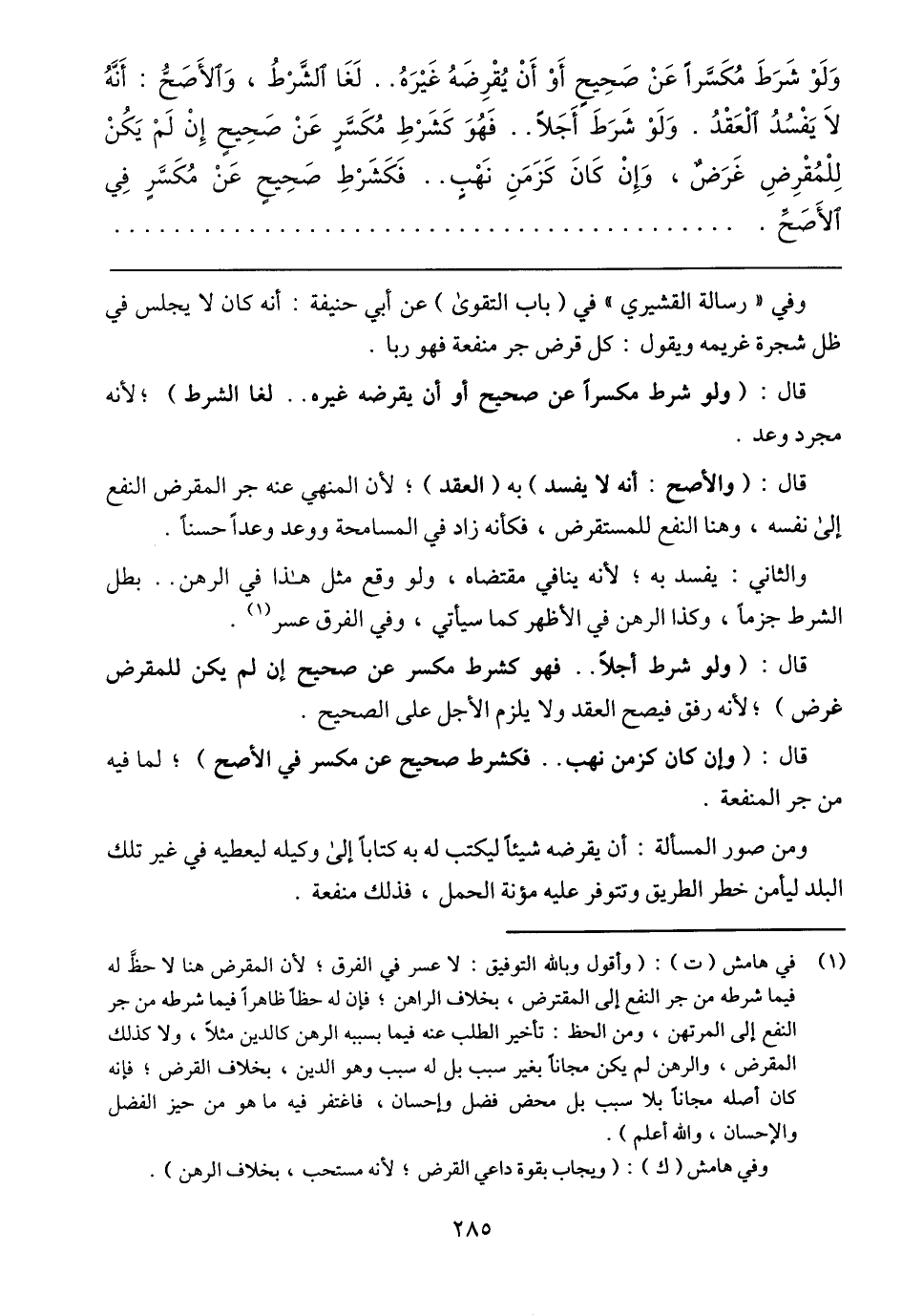 وفي (رسالة القشيري) في (باب التقوى) عن أبي حنيفة: أنه كان لا يجلس في ظل شجرة غريمه ويقول: كل قرض جر منفعة فهو ربا.
