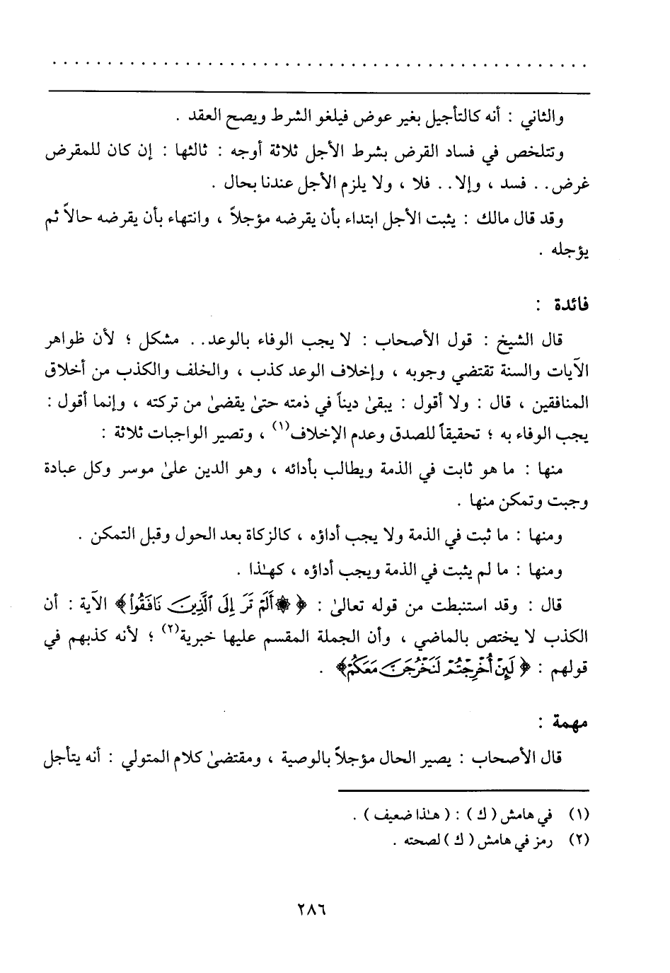 قال الشيخ: قول الأصحاب: لا يجب الوفاء بالوعد .. مشكل؛ لأن ظواهر الآيات والسنة تقتضي وجوبه، وإخلاف الوعد كذب، والخلف والكذب من أخلاق المنافقين، قال: ولا أقول: يبقى دينًا في ذمته حتى يقضى من تركته، وإنما أقول: يجب الوفاء به؛ تحقيقًا للصدق وعدم الإخلاف، وتصير الواجبات ثلاثة: