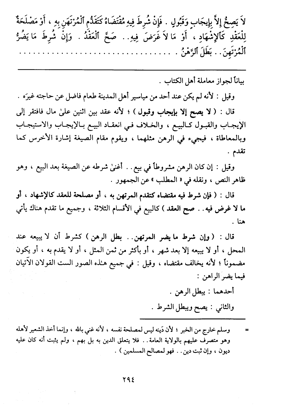 لَا يَصِحُّ إِلَّا بِإِيجَابٍ وَقَبُولٍ. فَإِنْ شُرِطَ فِيهِ مُقْتَضَاهُ كَتَقَدُّمِ الْمُرْتَهَنِ بِهِ، أَوْ مَصْلَحَةٌ لِلْعَقْدِ كَالإِشْهَادِ، أَوْ مَا لَا غَرَضَ فِيهِ .. صَحَّ الْعَقْدُ. وَإِنْ شُرِطَ مَا يَضُرُّ الْمُرْتَهِنَ .. بَطَلَ الرَّهْنُ