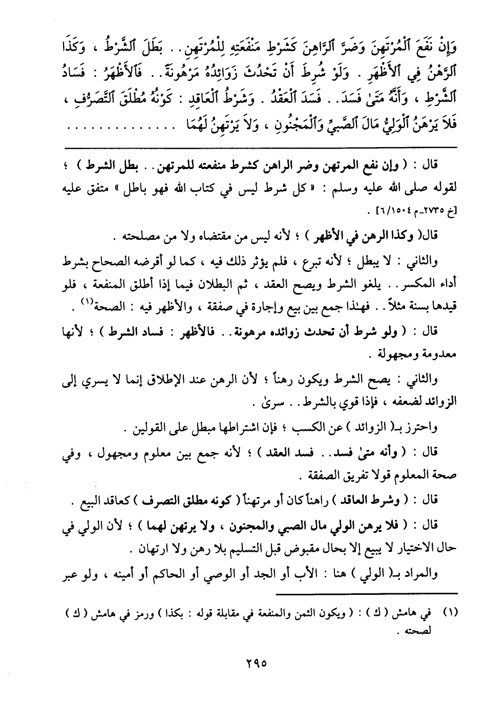 وَإِنْ نَفَعَ الْمُرْتَهِنَ وَضَرَّ الرَّاهِنَ كَشَرْطِ مَنْفَعَتِهِ لِلْمُرْتَهِنِ .. بَطَلَ الشَّرْطُ، وَكَذَا الرَّهْنُ فِي الأَظْهَرِ. وَلَوْ شُرِطَ أَنْ تَحْدُثَ زَوَائِدُهُ مَرْهُونَةً .. فَالأَظْهَرُ: فَسَادُ الشَّرْطِ وَأَنَّهُ مَتَى فَسَدَ .. فَسَدَ الْعَقْدُ. وَشَرْطُ الْعَاقِدِ: كَوْنُهُ مُطْلَقَ التَّصَرُّفِ، فَلَا يَرْهَنُ الْوَلِيُّ مَالَ الصَّبيِّ وَالْمَجْنُونِ، وَلَا يَرْتَهِنُ لَهُمَا