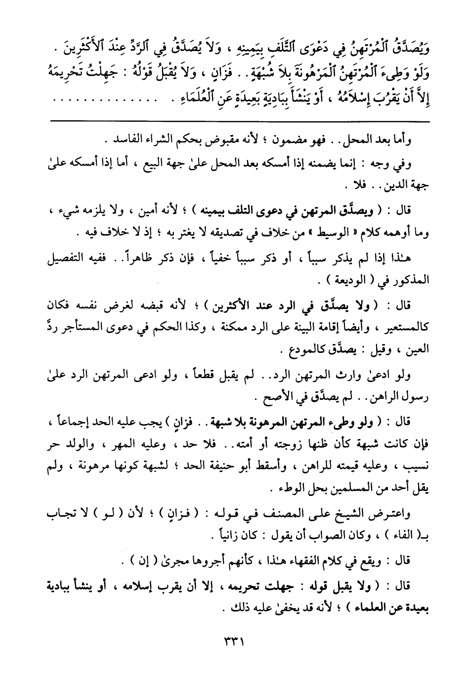 وَيُصَدَّقُ الْمُرْتَهِنُ فِي دَعْوَى التَّلَفِ بِيَمِينِهِ، وَلَا يُصَدَّقُ فِي الرَّدِّ عِنْدَ الأَكْثَرِينَ. وَلَوْ وَطِئَ الْمُرْتَهِنُ الْمَرْهُونَةَ بِلَا شُبْهَةٍ .. فَزَانٍ، وَلَا يُقْبَلُ قَوْلُهُ: جَهِلْتُ تَحْرِيمَهُ إِلَّا أَنْ يَقْرُبَ إِسْلَامُهُ، أَوْ يَنْشَأَ بِبَادِيَةٍ بَعِيدَةٍ عَنِ الْعُلَمَاءِ