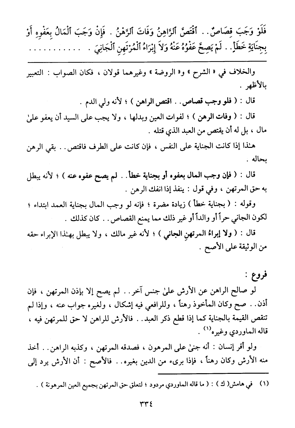 فَلَوْ وَجَبَ قِصَاَصٌ .. اقْتَصَّ الرَّاهِنُ وَفَاتَ الرَّهْنُ. فَإِنْ وَجَبَ الْمَالُ بِعَفْوِهِ أَوْ بِجِنَايَةِ خَطَأٍ .. لَمْ يَصِحَّ عَفْوُهُ عَنْهُ وَلَا إِبْرَاءُ الْمُرْتَهِنِ الْجَانِيَ